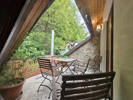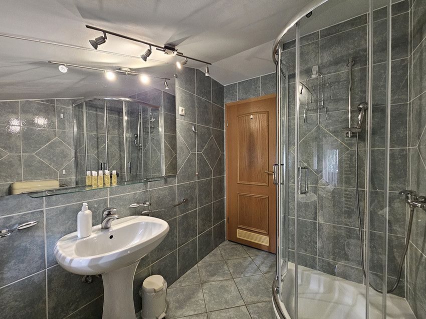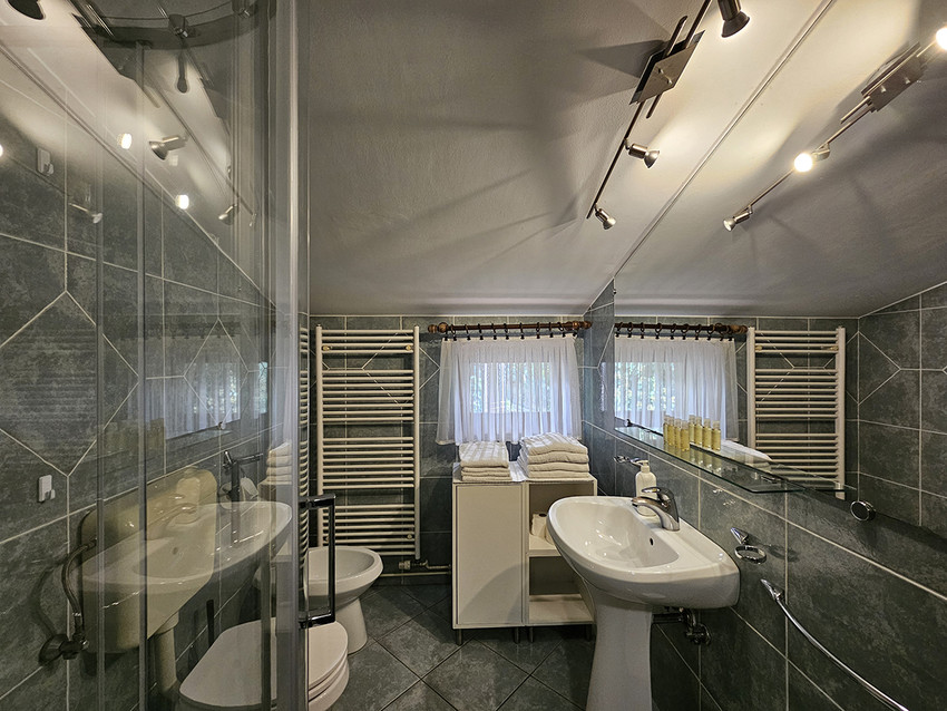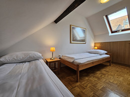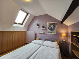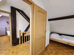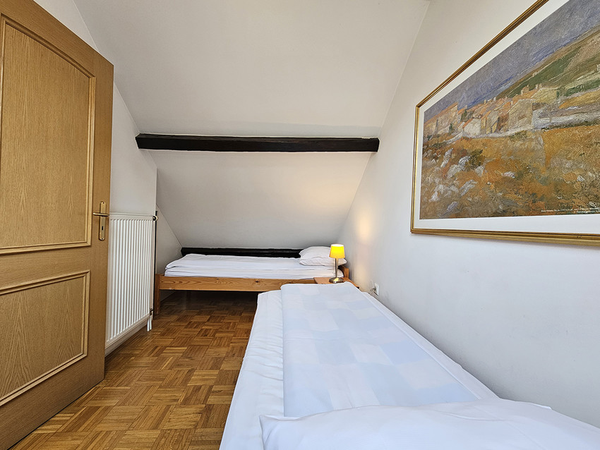 Spazioso duplex, arredato ex-novo. Primo piano con cucina arredata con tavola per 6 persone, frigorifero, lavastoviglie, piano cottura e forno, soggiorno con arredamento in pelle ed accesso sul terrazzo, bagno con cabina doccia. Lavatrice nell'anticamera. Al secondo piano si trovano 2 camere, una con letto da una piazza e mezzo (140 x 200 cm), l'altra libera. A disposizione LCD CATV via cavo, l’accesso internet gratuito, telefono e climatizzatore. Situato al piano terra di edificio classico.