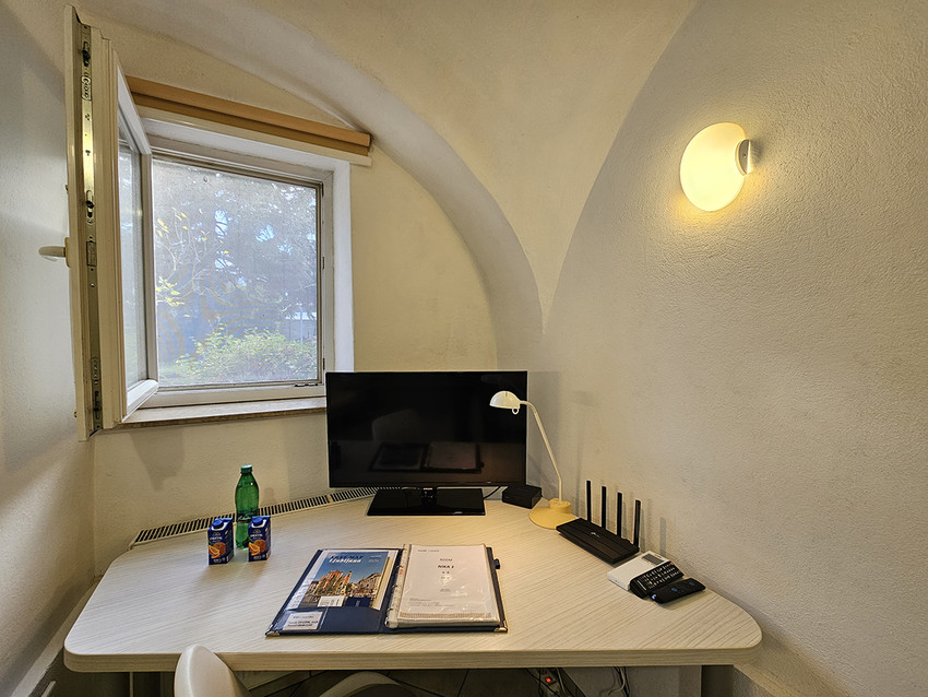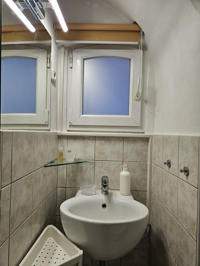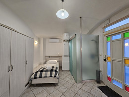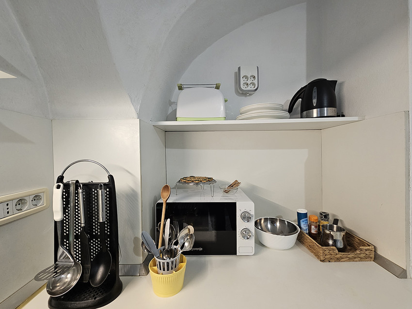The studio is on the ground floor and has its own entrance from the courtyard. It is furnished with a single bed (90 x 200 cm), a corner multipurpose table, kitchenette with an electric cooker, microwave, refrigerator, dishes and tableware. It has a small private bathroom with a shower, washbasin and a toilet. It is provided with TV, free broadband wired and wireless Wi Fi internet access, air conditioning, bed linen, towels and a hairdryer.