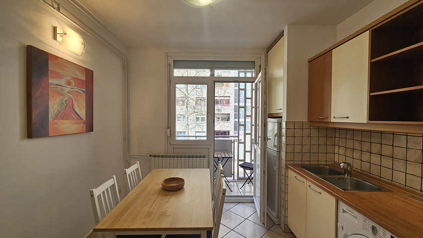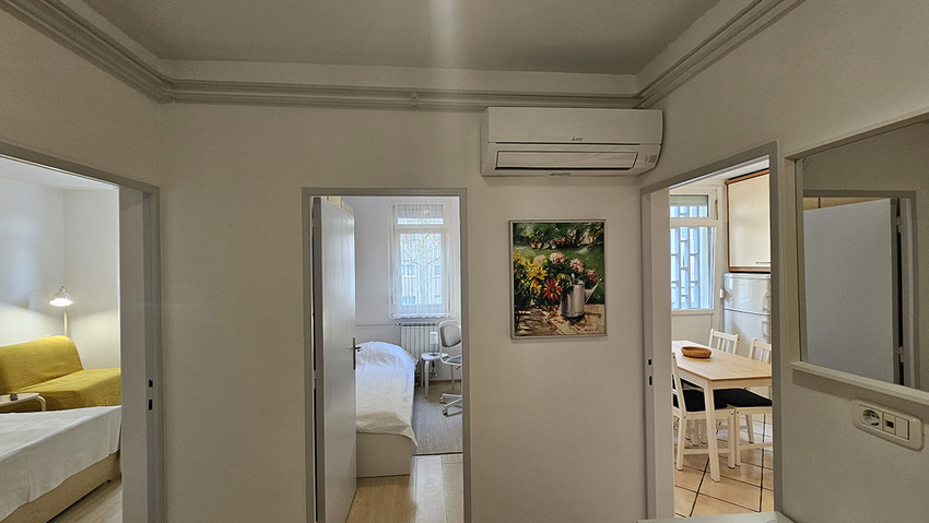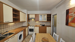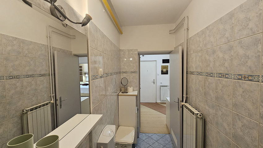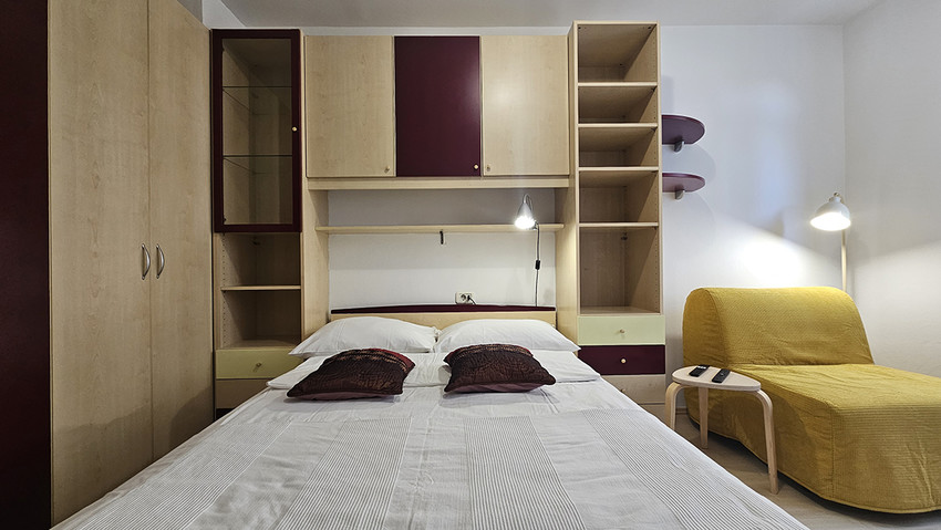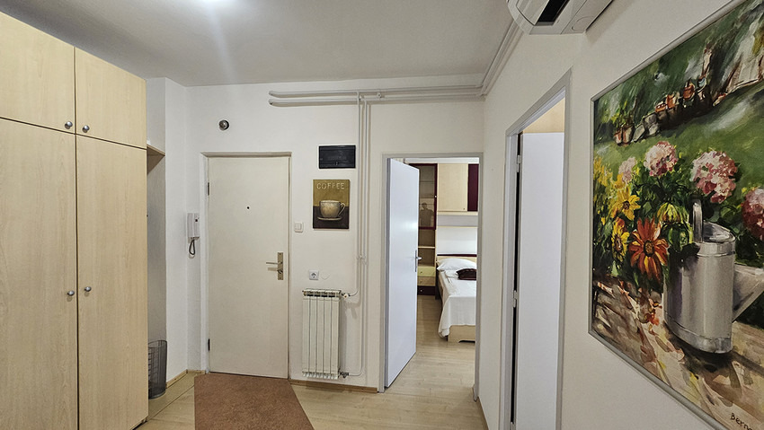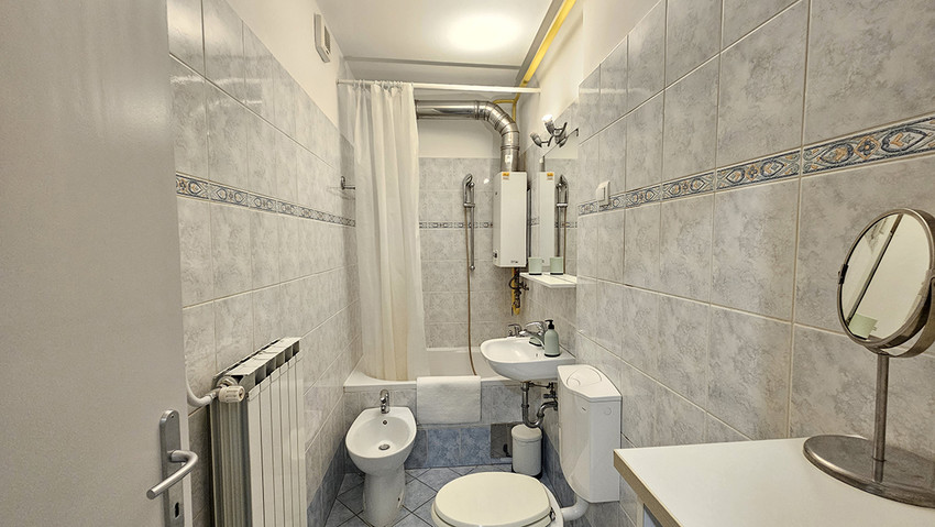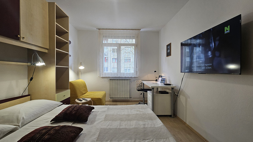 L'appartamento ha una camera da letto con letto matrimoniale (140 x 200 cm) e l'angolo soggiorno con il divano letto (120 ×200 cm) e scrivania, un'altra camera con il letto singolo e un’altra scrivania, la cucina elettrica con il forno ed un grande frigorifero, toaster, lavasciugatrice, il bagno con la vasca da bagno, ed il balcone. L'appartamento e completamente attrezzato con tutti gli apparecchi domestici, ferro e asse da stiro, asciuga capelli, fon, CATV, l'accesso internet gratuito. L'appartamento si trova al primo piano di un edificio senza ascensore.